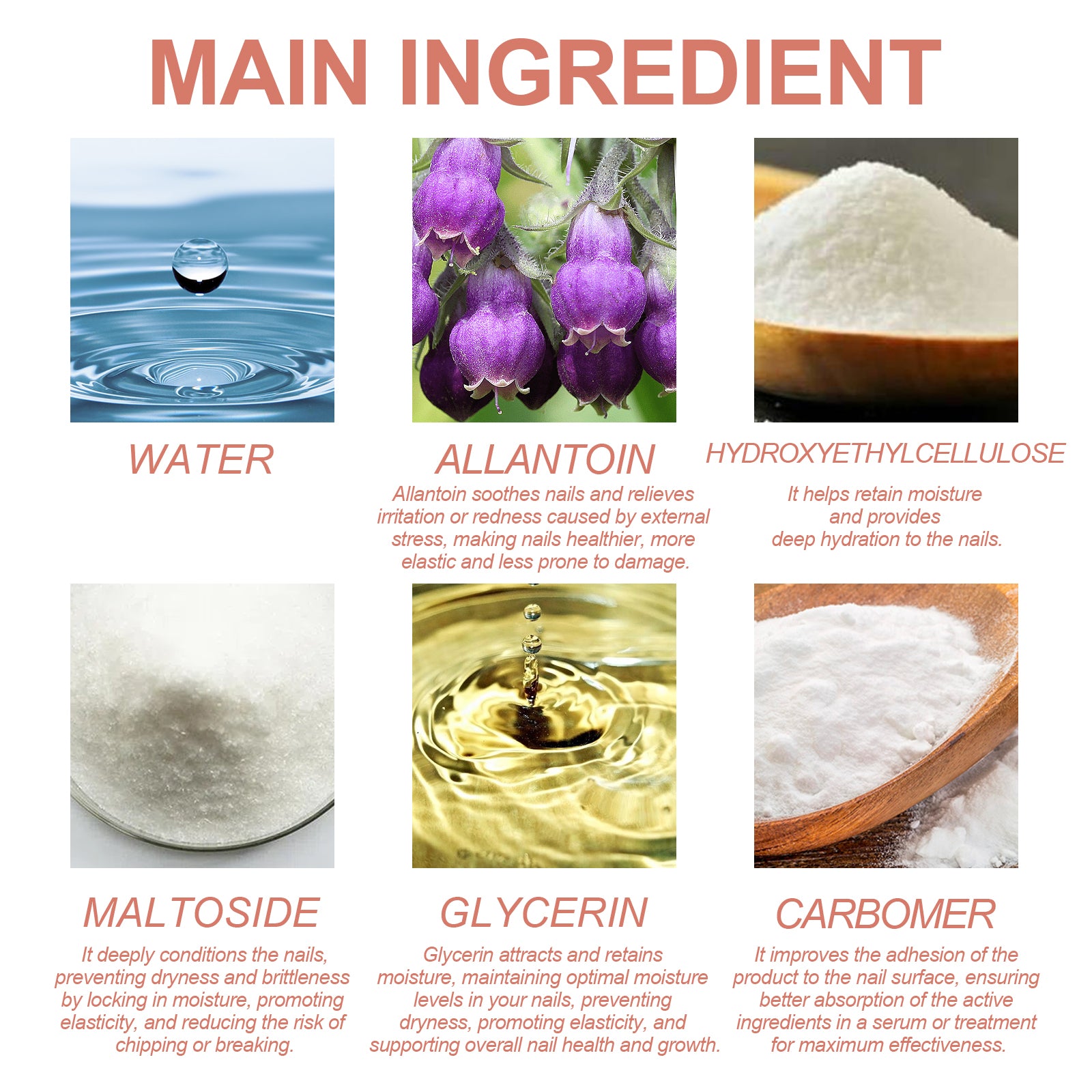 Our 7-day Nail Repair serum contains hydroxyethyl cellulose, maltoside and carbomer. It can help nourish nails for rapid growth while enhancing nail recovery and health and reducing the effects of nail breakage and injury. Its application method is very simple: first clean and dry the affected nails, then apply an appropriate amount of essence to the nails and epidermis, gently massage 3 Wait 2-3 minutes, and finally until the essence is absorbed, use for 7 days to help the nails grow and recover quickly.