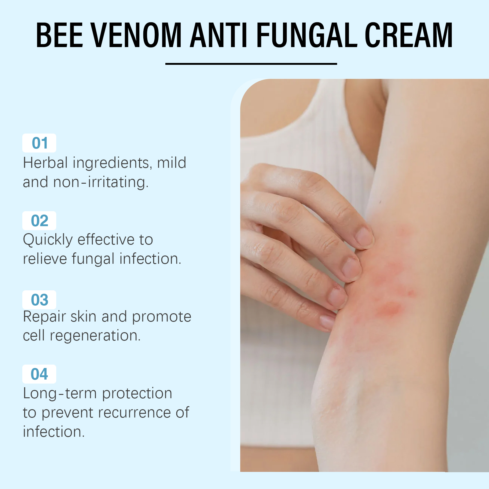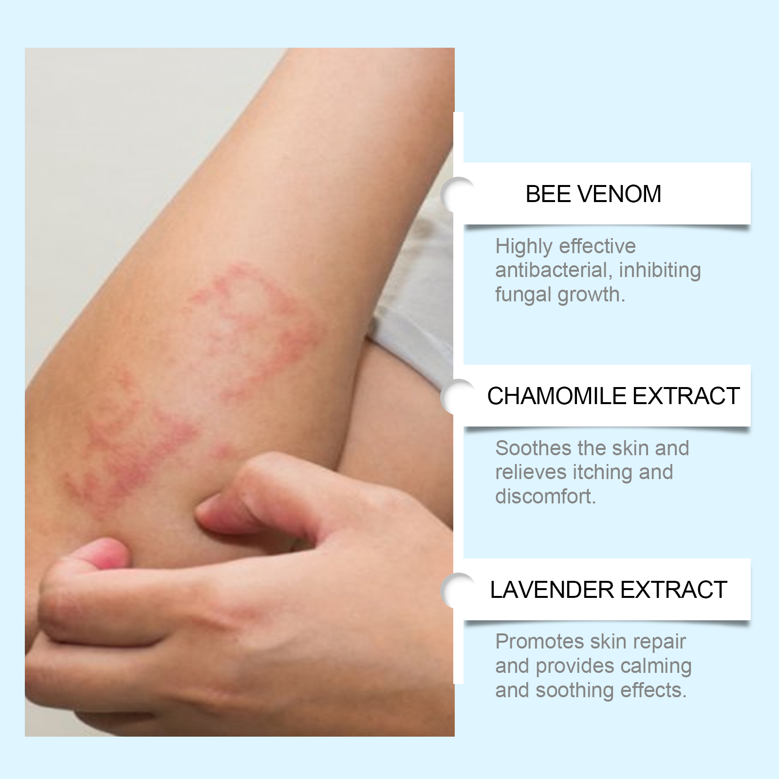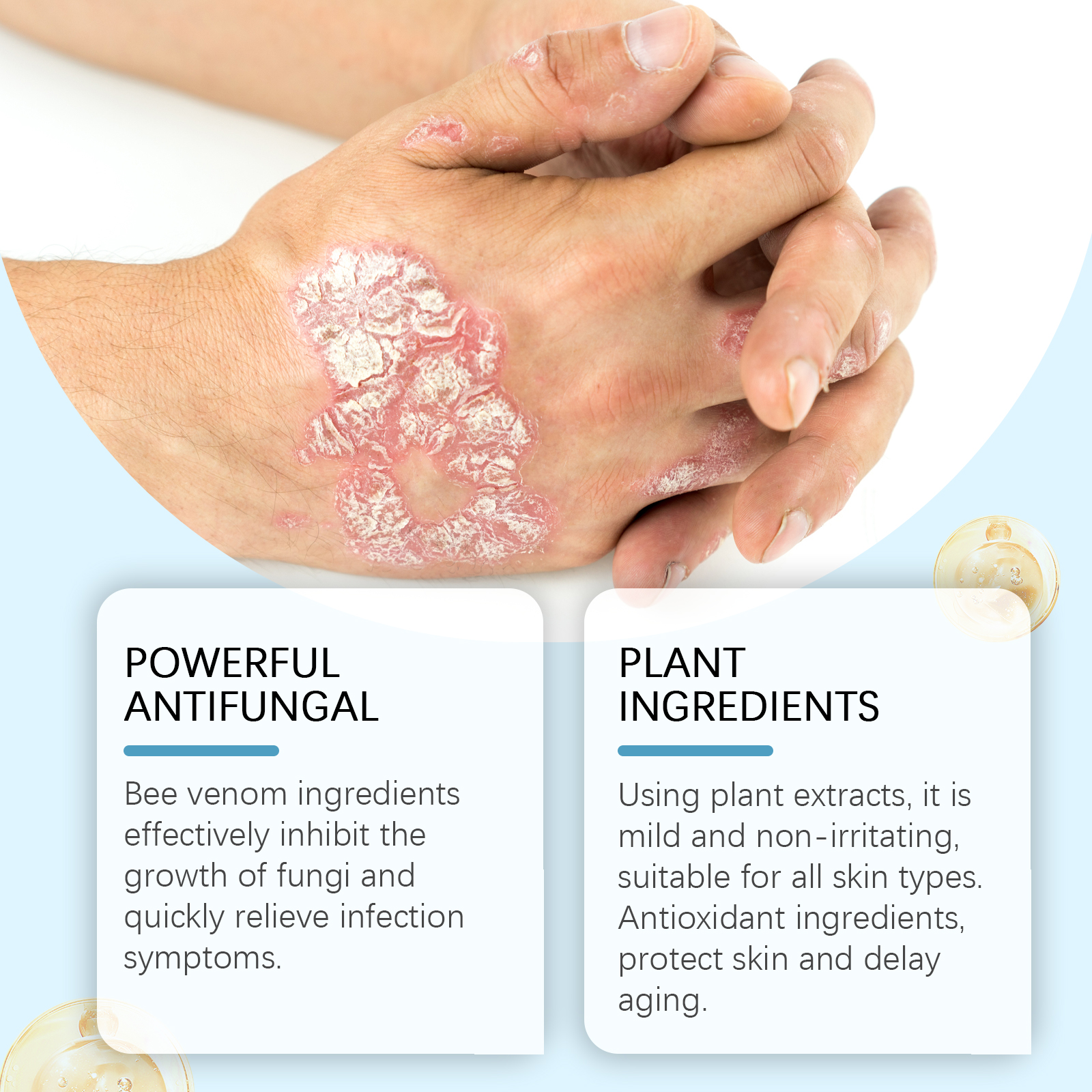 Our body care cream contains bee venom, chamomile extract, lavender extract. It can effectively inhibit fungal growth and quickly relieve symptoms of infection. After application, it quickly penetrates into the skin and quickly relieves itching, redness and other symptoms. Its application is simple: 1. Thoroughly clean and dry your skin. 2. Apply appropriate amount of this product evenly on hands, legs and other parts of the body with fungal growth. 3. Massage gently to promote better absorption. Using plant extract, mild and non-irritating, suitable for all skin types, containing antioxidant ingredients, protect skin and delay aging.