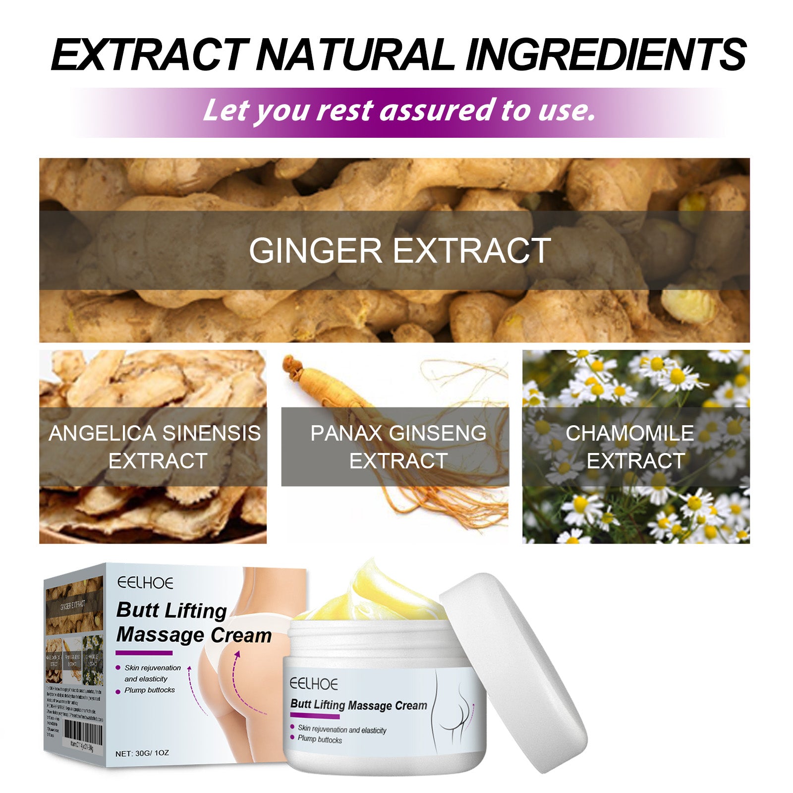Our butt lift cream contains angelica extract, ginseng extract and chamomile extract. It helps to enhance the elasticity of smooth and beautiful hips. Its use method is very simple: 1. Apply the appropriate amount to the skin. 2. Place palms on hips and gently massage. 3. Press 10 times from the waist to the hips, and wave 10 times from the hips to the thighs. Tighten and plump hips after use, improve charm, and make the body more perfect.