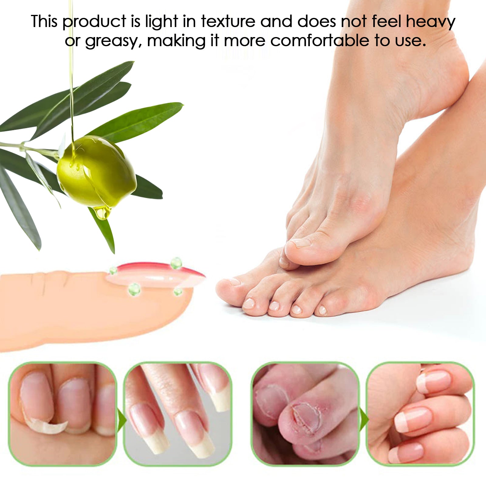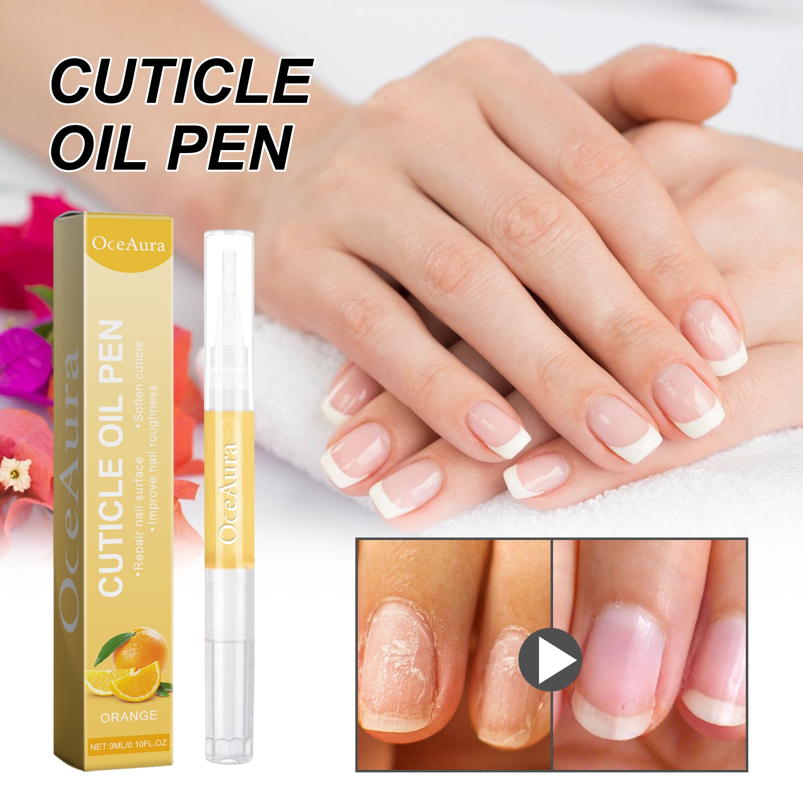 Our Cuticle Oil Pen contains Citrus Aurantium Dulcis(Orange) Fruit Extract, Olea Europaea(Olive) Fruit Extract, Vitis Vinifera(Grape)Seed Oil. It can deeply nourish nails, provide nutrients for nail growth, reduce weak and fragile nails, prevent peeling, repair damage, and protect nail beds. Its application is simple: clean your nails, remove excess dead skin, remove the lid of the product, turn the brush head clockwise until the nail polish comes out of the brush head, apply the oil to the nail and gently massage it with your fingertips for 1-3 minutes until it is completely absorbed. It can help repair the surface of your nails, improve the shine and restore your nails to their original beauty.