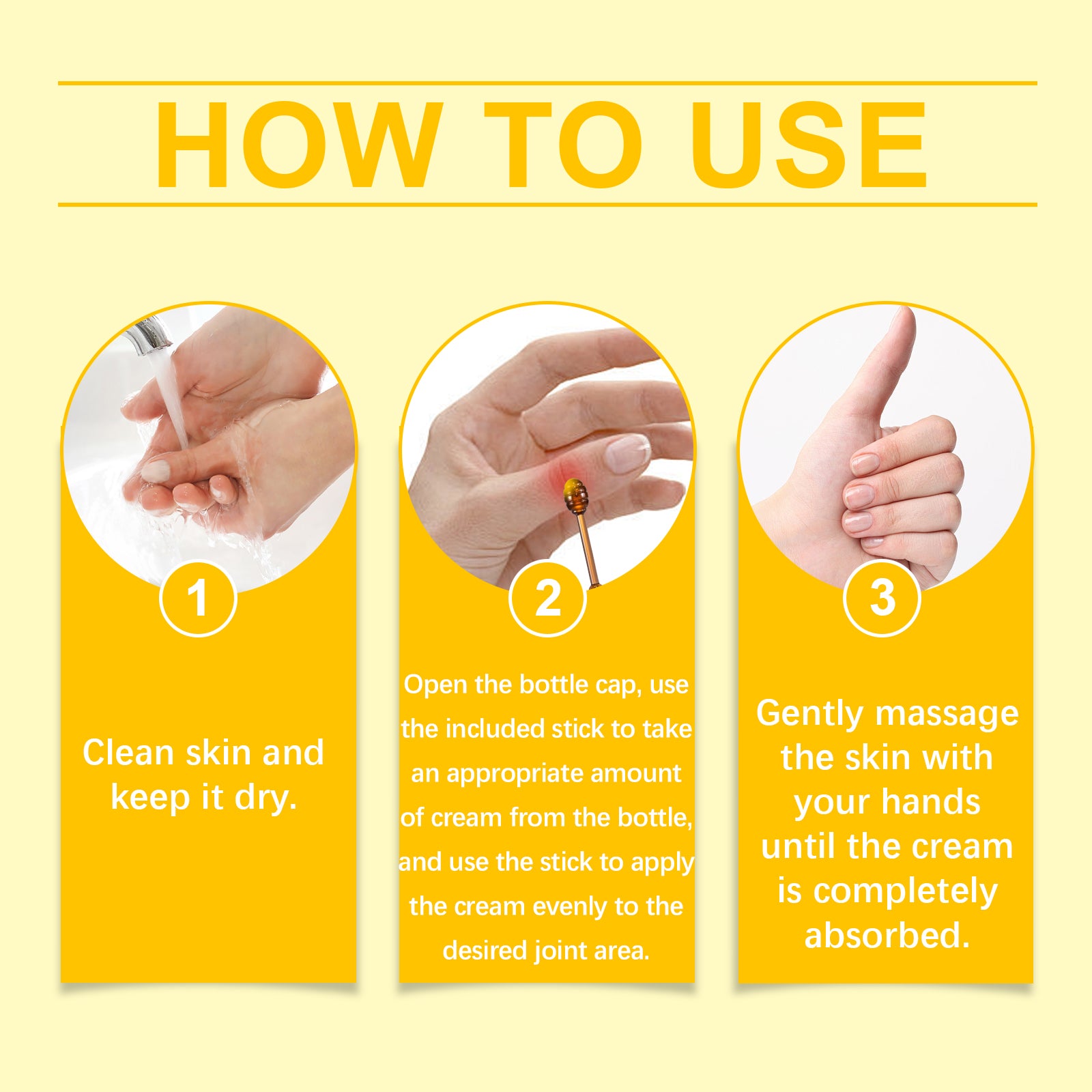Our bee Venom bone and joint cream contains bee venom, arnica extract and chondroitin sulfate sodium. It can provide unique nutrients and relieve joint pain. Help joints repair quickly and protect joint health. Helps keep joints lubricated and reduces friction, thereby reducing pain and improving joint flexibility. The way to use it is simple: 1. Clean your skin and keep it dry. 2. Open the cap, remove the appropriate amount of cream from the bottle with the included stick, and use the stick to evenly apply the cream to the desired joint area. 3. Gently massage the skin with your hands until the cream is completely absorbed. Bee Venom Bone and joint Cream absorbs quickly, is non-sticky, is convenient for daily use, promotes the elasticity of joint skin, and helps increase the range of motion. Penetrate into the tissues surrounding the joint to provide comprehensive care from the inside out.