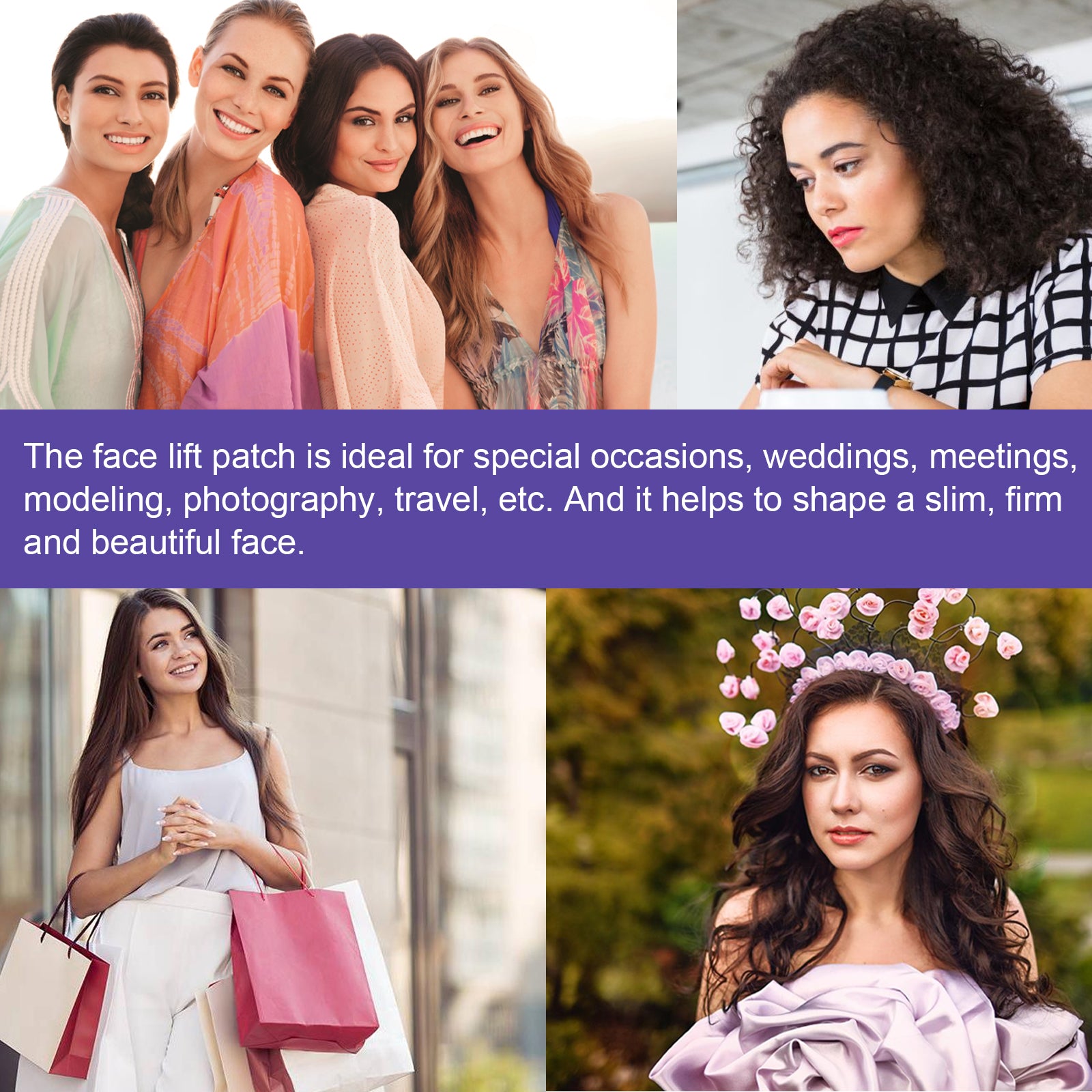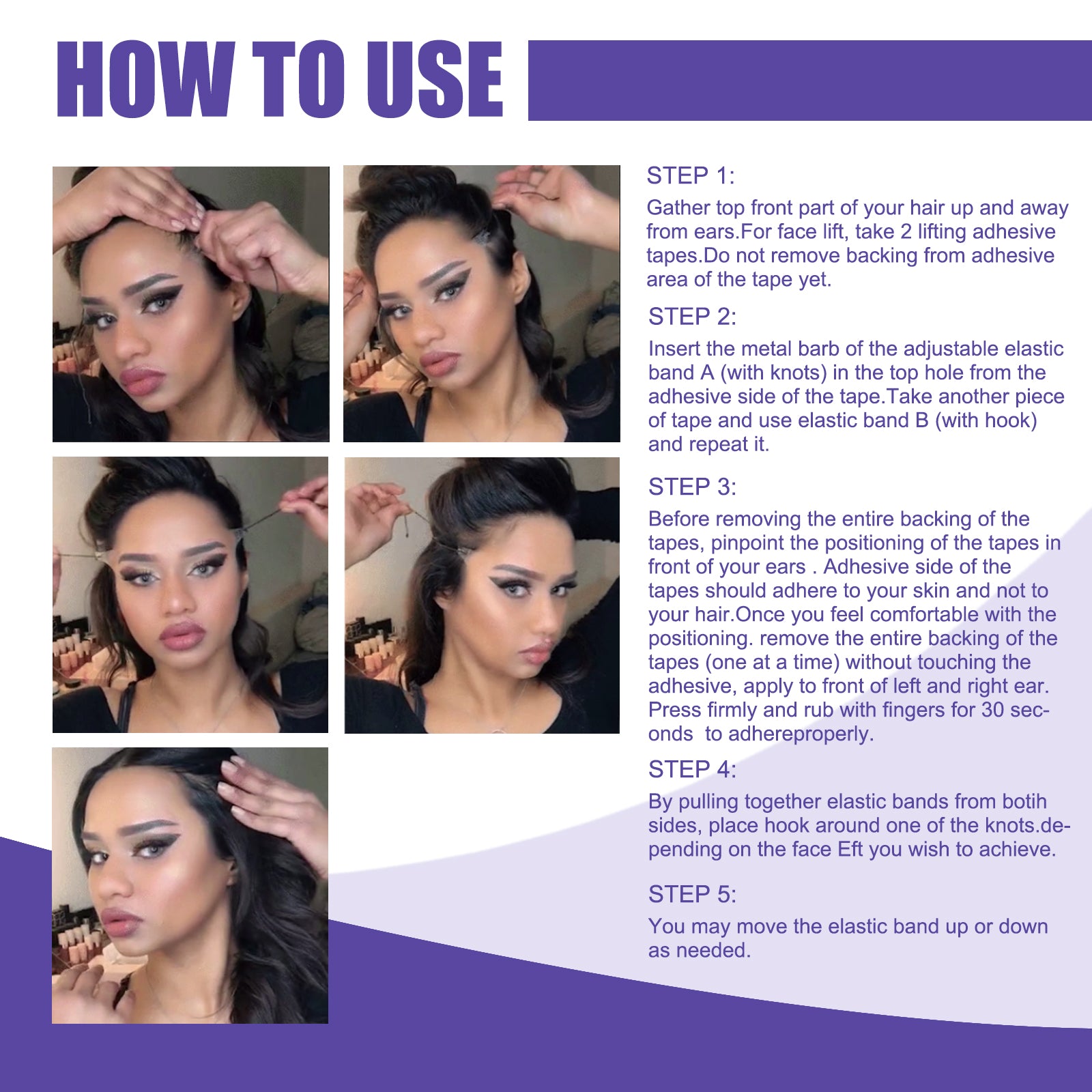 Our V-Shaped Thin Face Stickers contains mandelic acid, collagen, hyaluronic acid. It can waterproof, ticity and face wil not be tight, it helps to shape a slim, strong and beautiful face. Its application method is very simple: Gather top front part of your hair up and away from ears.For face lift, take 2 lifting adhesive tapes. Do not remove backing from adhesive area of the tape yet. Insert the metal barb of the adjustable elastic band A (with knots) in the top hole from the adhesive side of the tape.Take another piece of tape and use elastic band B(with hook) and repeat it. Before removing the entire backing of the tapes, pinpoint the positioning of the tapes in front of your ears . Adhesive side of the tapes should adhere to your skin and not to your hair. Once you feel comfortable with the positioning, remove the entire backing of the tapes (one at a time) without touching the adhesive, apply to front of left and right ear. Press firmly and rub with fingers for 30 seconds to adhereproperly. By pulling together elastic bands from botih sides, place hook around one of the knots, depending on the face Eft you wish to achieve. You may move the elastic band up or down as needed. Make facial lines more smooth and compact, and radiate youthful vitality.